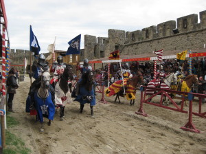 Llega la chica encargada del camping y pagamos 25,40 euros por las dos noches. Todo un chollo. Volvemos a ir a Carcassonne para esta vez pasar todo el día. En una de las tiendas compramos un escudo y una espada a Nerea y Eneko para que se entretengan y nos dejen ver un poco el pueblo. Entre las murallas y el pueblo vemos un espectáculo de justas medievales con caballos. Muy entretenido, simulando una justa medieval. Sobre las siete de la tarde volvemos al camping. Justo nos da tiempo de cenar, ya que a las nueve empieza a llover. Entramos a la caravana donde sólo nos queda leer, jugar un rato y luego a descansar.
